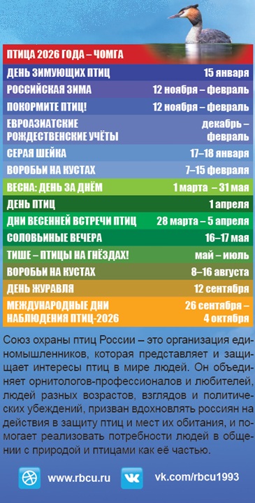 Cоюз охраны птиц России - общероссийская общественная организация, основная деятельность которой направлена на информирование, просвещение и объединение широких кругов населения с целью сохранения видового разнообразия и численности птиц на территории России. Контакты