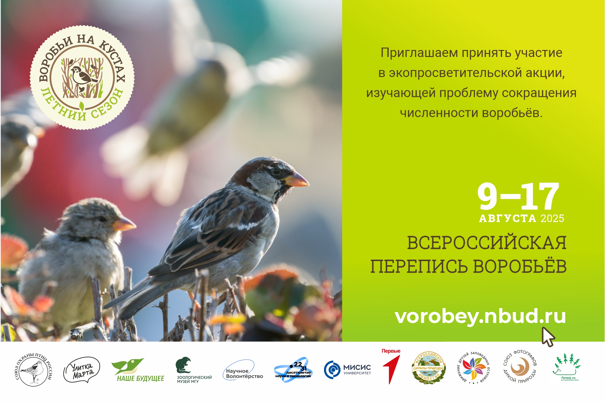 С 9 по 17 августа 2025 года приглашаем всех желающих по всей России к участию в летнем сезоне ВСЕРОССИЙСКОЙ ПЕРЕПИСИ ВОРОБЬЁВ «Воробьи на кустах».